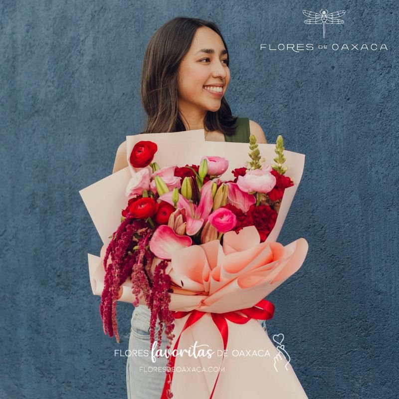 Precioso Bouquet con flores premium. Incluye Ranunculus, Calas,  Lilis, SnapDragon, Clavel  vino, Lisianthus y Amaranto.