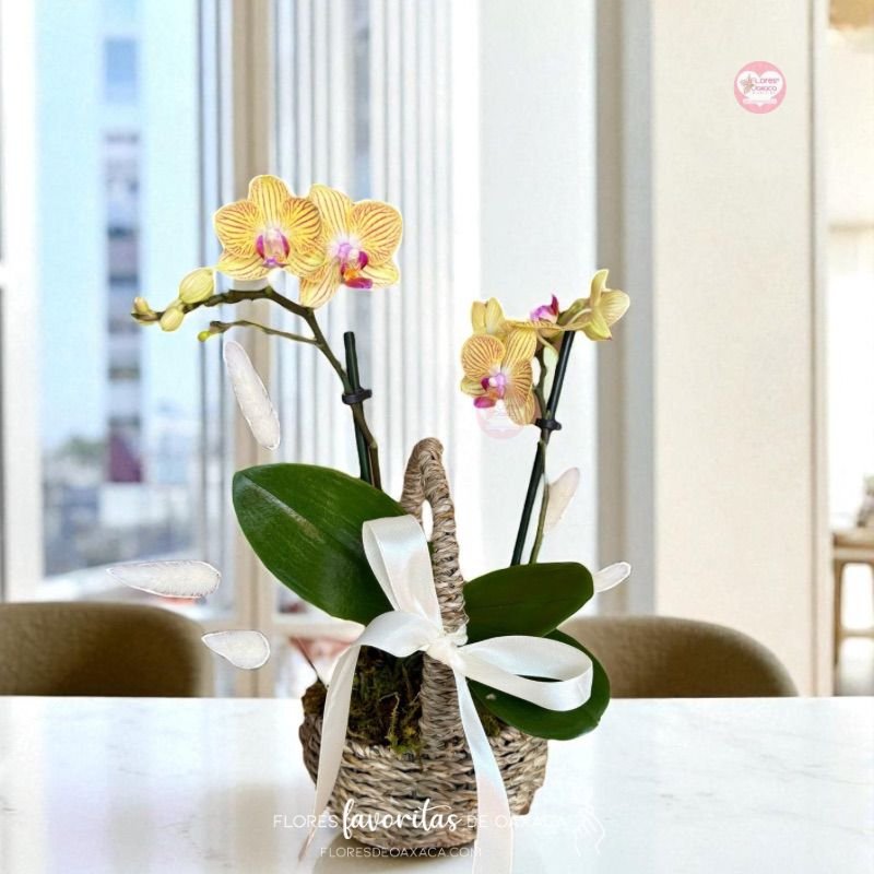 Precisa orquidea phalaenopsis mini de aproximadamente 35cm de altura acompañada de Bunny tails y presentada en un cesto floral.
