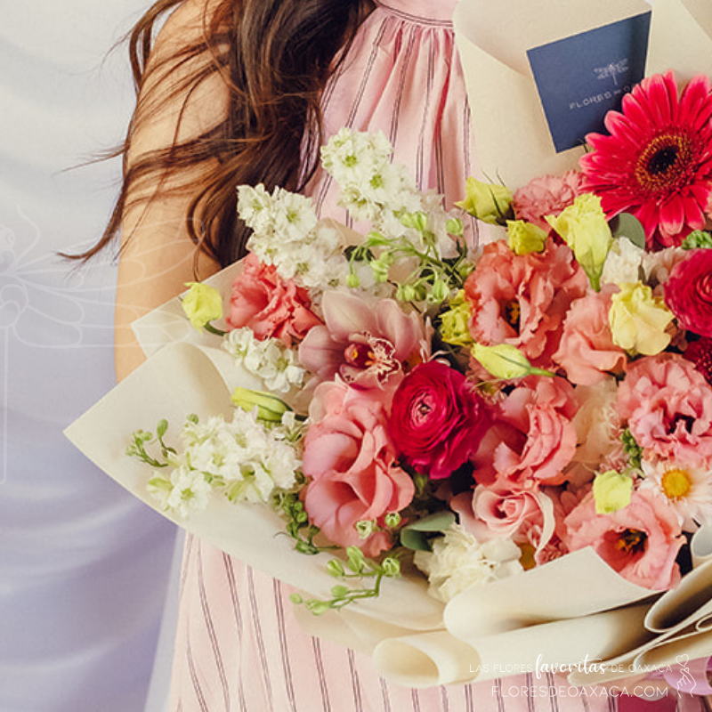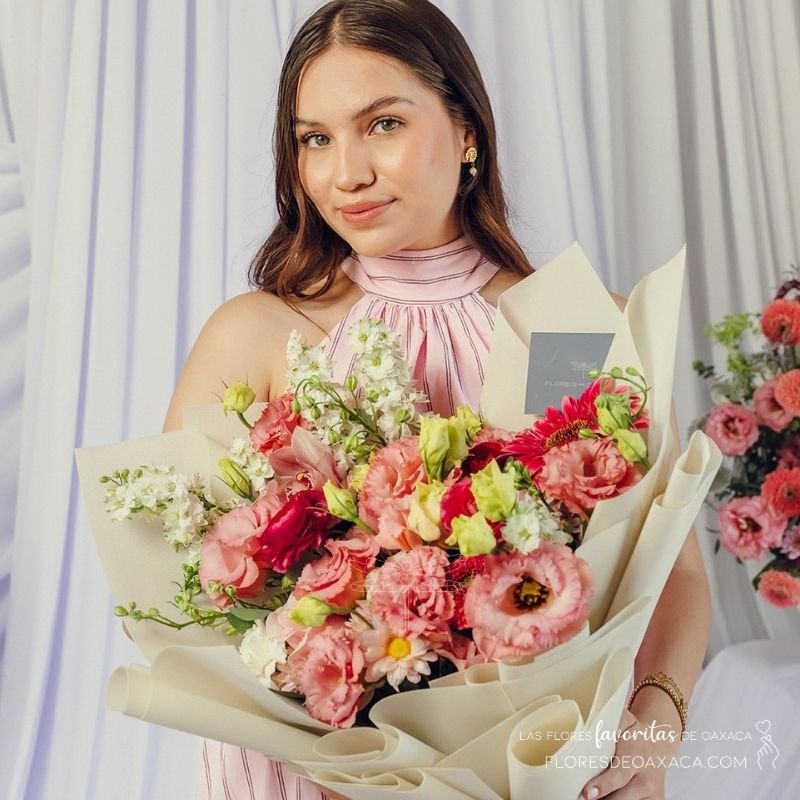 Precioso bouquet en bellos tonalidades rosas con toques blancos y verdes.