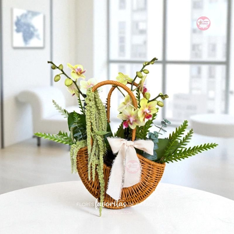 Preciosa orquidea phalaenopsis mini ( de 2 o 3 tallos segun disponibilidad) de aproximadamente 35cm de altura acompañada de follajes como amaranto y grafilia ( losfallajes pueden variar de acuerdo a disponibilidad)