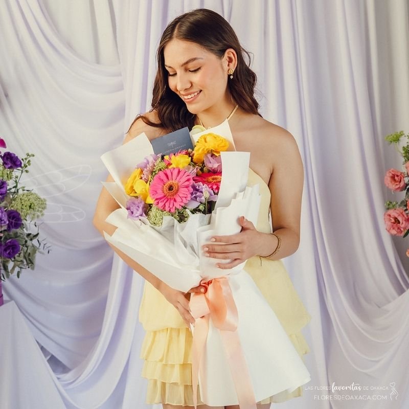 Las gerberas aportan un toque radiante y juvenil, mientras que las flores en tonos suaves equilibran el diseño con delicadeza y dulzura. Envuelto en papel elegante, este bouquet es ideal para sorprender, celebrar y llenar de color cualquier ocasión especial.